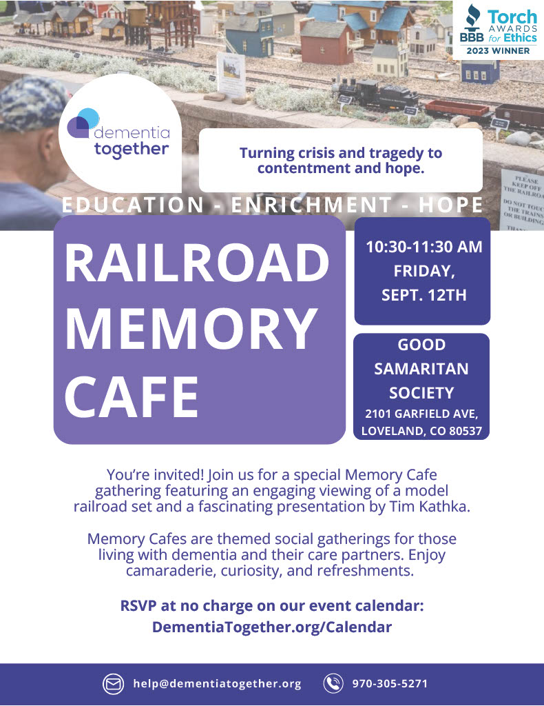 Join us for a special Memory Cafe gathering featuring an engaging viewing of a model railroad set and a fascinating presentation by Tim Kathka at Good Samaritan Society Loveland Village.  2101 Garfield Ave, Loveland, CO 80537